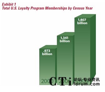 據(jù)權(quán)威的客戶忠誠度研究機(jī)構(gòu)COLLOQUY在2009出版的一份報告,2008年底,全美客戶忠誠度計劃的參與人次達(dá)到18.07億,平均每個美國家庭參與了14.1個忠誠度計劃,相較2006年底的13.41億參與人次,共增了了24.73%(連續(xù)兩年環(huán)比增長12%/年),而同期美國的GDP增長僅為2.2%。從這一點上看,美國企業(yè)對忠誠度營銷的熱情不減,盡管忠誠度營銷在美國已相當(dāng)成熟,但美國企業(yè)仍然把它當(dāng)作是營銷的重要工具。