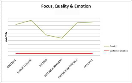 第二張圖片中客戶在很生氣的狀態(tài)下開始呼叫,而代理除了幫助階段外表現(xiàn)得都很好。該代理執(zhí)行的是最低績效標(biāo)準(zhǔn),但他對(duì)客戶的影響卻等于零。分析師提出了一個(gè)非常明顯而重要的關(guān)節(jié)——幫助是整個(gè)呼叫中最為重要的環(huán)節(jié)。這就是我們要做的事情。如果在幫助這一環(huán)上沒做好,那么其它環(huán)節(jié)如感謝客戶、問候客戶等等都變得無足輕重。
