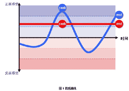 諾貝爾獎(jiǎng)得主心理學(xué)家Daniel Kahneman發(fā)現(xiàn)人們在一次體驗(yàn)中只會記住兩件事:峰值感受(流程中最好或最差的一點(diǎn))以及終了感受。我運(yùn)用“峰值——終了規(guī)則”將每個(gè)子流程上的情感感受按照自然時(shí)間順序連成一根“情感”曲線,如圖1所示。