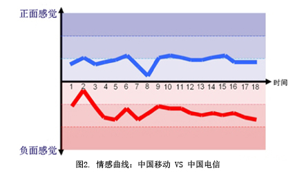 圖2的情感曲線分別是中國移動(dòng)的“喜愛”情感曲線和中國電信的“討厭”情感曲線,對應(yīng)于雙方整個(gè)呼入電話體驗(yàn)18個(gè)子流程上的情感感受。(注意,我們只列出了中國移動(dòng)的“喜愛”曲線和中國電信的“討厭”曲線來舉例說明。)