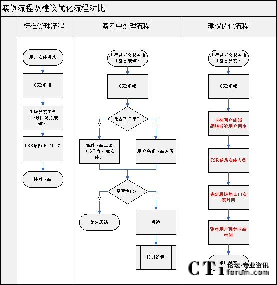 通過對(duì)比,很明顯后者減少了流程中的關(guān)鍵角色,提高了流程的執(zhí)行效率。CSR直接為用戶提供了“一站式服務(wù)”,用戶只需要通過一個(gè)電話便能解決問題,而至于CSR與安裝人員的工作協(xié)調(diào),完全不需要用戶去介入。