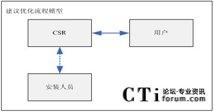 對(duì)于客服中心來講,當(dāng)受理了用戶的需求時(shí),CSR與用戶便成了服務(wù)流程中的關(guān)鍵角色,安裝人員只是CSR的一個(gè)協(xié)作角色(內(nèi)部流程下游角色)。如果在為用戶提供服務(wù)過程中,將安裝人員“引入”流程中,無疑將影響流程的執(zhí)行效果。另外,讓用戶代替CSR去聯(lián)系“安裝人員”這更加影響用戶的感受。