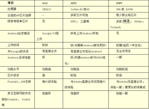 這三種處理器架構(gòu)各有優(yōu)缺點,都希望成為未來Android互聯(lián)網(wǎng)電視(如果成功的話)的最主流平臺。那么哪一個處理器將最終勝出呢,答案只有留給時間來揭曉,我們不妨先來對這三個架構(gòu)進行一番比較: