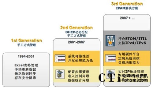 新一代網(wǎng)絡(luò)核心服務(wù)自動化管理支撐平臺能自動、有效地管理訪問網(wǎng)絡(luò)的IP/MAC 資源,實時提供更新數(shù)據(jù),控制未授權(quán)IP/MAC地址訪問網(wǎng)絡(luò),從而提高內(nèi)部網(wǎng)絡(luò)的可管理性和安全性。下圖是網(wǎng)絡(luò)核心服務(wù)解決方案的所經(jīng)歷的發(fā)展階段: