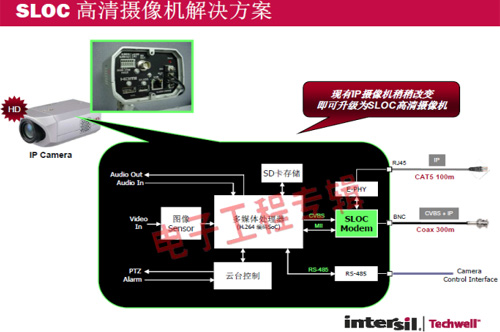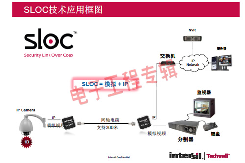 革命性的Intersil Techwell SLOCTM(Security Link over Coax)同軸電纜復(fù)合視頻傳輸解決方案是可通過(guò)一條同軸電纜同時(shí)傳輸模擬 CVBS 視頻和高清數(shù)字 IP 視頻信號(hào)的先進(jìn)調(diào)制解調(diào)器解決方案,其采用最新MODEM PHY技術(shù)的傳輸解決方案,可以基于同軸電纜同時(shí)傳輸高清IP碼流和標(biāo)清模擬實(shí)時(shí)視頻。