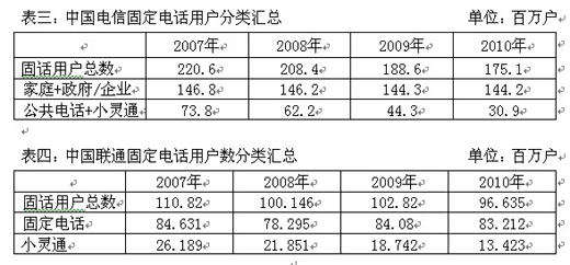 從表中可以看出,中國電信每年的固定電話用戶總數(shù)持續(xù)下降,下降速度最快的是小靈通業(yè)務,剔除小靈通和公共電話業(yè)務,中國電信的固定電話用戶量實際上一直穩(wěn)定在1.4億戶以上,中國聯(lián)通公司的固定電話用戶量則一直穩(wěn)定在8000萬戶以上。