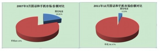 手機(jī)的增長(zhǎng)非常顯著,從2007年開始,手機(jī)用戶每年以42.7%的速度增長(zhǎng)。手機(jī)的市場(chǎng)份額從2007年的80.19%增加到2011年12月的96.47%,現(xiàn)在已經(jīng)遠(yuǎn)遠(yuǎn)超過(guò)了固話。
