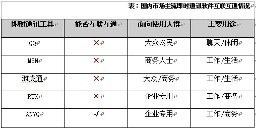 根據(jù)夏先生的提醒,筆者找到這了這個ANYQ的有關(guān)信息,據(jù)了解,該產(chǎn)品是面向企業(yè)用戶的一款商務(wù)協(xié)作軟件,其目的就是商務(wù)協(xié)作、統(tǒng)一通訊。因為該產(chǎn)品采用開放的國際標準協(xié)議——XMPP協(xié)議,使其具有聯(lián)系多個即時通訊信息孤島的能力。通過各個嵌入式的網(wǎng)關(guān),企業(yè)可以通過ANYQ與OICQ、ICQ、AIM、MSN、YAHOO上的客戶、合作伙伴進行聯(lián)系、實時交流、公文共享等企業(yè)來往。