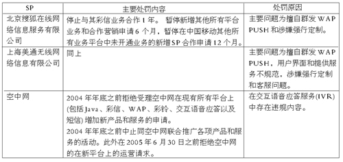 一方面是信息產(chǎn)業(yè)部管理手段的加強(qiáng),另一方面則是運(yùn)營商管理方式的嚴(yán)肅,從表格中可以看出,中國移動對SP的懲罰已經(jīng)具有相當(dāng)?shù)牧Χ。在為增殖業(yè)務(wù)打造了相關(guān)的業(yè)務(wù)品牌之后,整個產(chǎn)業(yè)鏈條的控制權(quán)目前還是掌握在運(yùn)營商手中。
