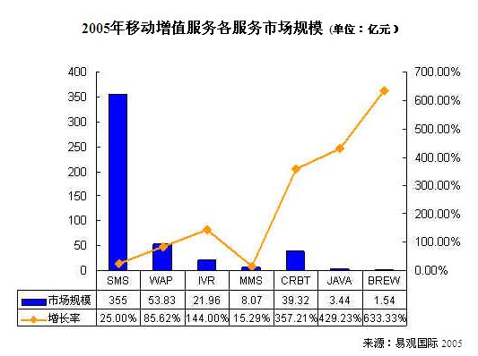 2005年移動(dòng)增值服務(wù)各服務(wù)市場(chǎng)規(guī)模圖