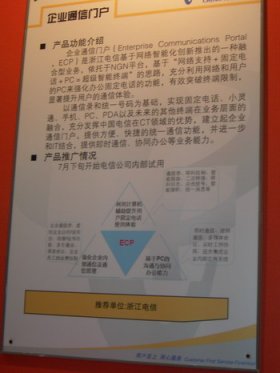 近日,中國(guó)電信在西安召開了上半年市場(chǎng)工作會(huì)議暨新產(chǎn)品展示專題研討會(huì),在此次會(huì)議上,各省電信公司分別展示了自己面向市場(chǎng)開發(fā)的新型業(yè)務(wù)。其中,來自浙江電信的一種叫企業(yè)通信門戶ECP(Enterprise Communications Portal)的主推業(yè)務(wù)在展示過程中吸引了眾多目光,引起了其他與會(huì)代表的關(guān)注,被認(rèn)為是中國(guó)電信拓展企業(yè)市場(chǎng)空間的最具潛力產(chǎn)品之一。