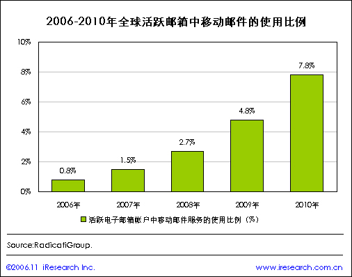 iResearch艾瑞市場咨詢根據(jù)市場咨詢公司RadicatiGroup公布的調(diào)查結(jié)果整理顯示,在2006年全球活躍電子郵箱賬號中有0.8%使用移動電子郵件服務(wù),移動電郵將會逐漸為高端用戶所接受,RadicatiGroup預(yù)計(jì)到2010年活躍電子郵箱賬號中使用移動電郵服務(wù)的比例將達(dá)到7.8%.