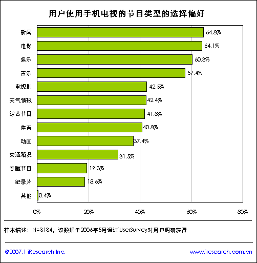iReserach艾瑞市場咨詢《2007年手機電視研究報告》研究結(jié)果顯示,手機終端價格將是影響用戶使用手機電視業(yè)務的首要驅(qū)動因素,其次是手機電視服務資費標準。另外研究數(shù)據(jù)發(fā)現(xiàn),手機用戶希望在手機電視上看到的內(nèi)容類別情況:新聞、電影、娛樂和音樂是用戶首要選擇的電視節(jié)目類型,用戶的提及率均在60%以上,另外用戶希望能夠通過手機看電視劇、天氣預報、綜合節(jié)目和體育等節(jié)目類型。由此發(fā)現(xiàn),新聞、娛樂和生活類資訊是用戶期望手機電視節(jié)目的重要類型。