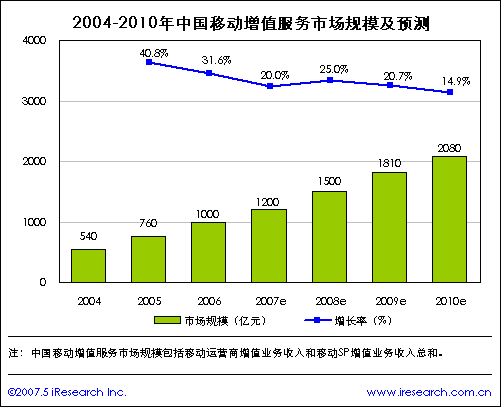 iResearch艾瑞市場咨詢研究成果《2007年移動增值研究報告》顯示,2006年中國移動增值市場規(guī)模達到了1000億元,比2005年增長31.6%。隨著市場不斷規(guī)范,中國移動增值市場2007年市場規(guī)模增長速度將趨于減緩,預(yù)測2007年中國移動增值市場規(guī)模為1200億元。受2008年奧運會的影響,屆時中國移動增值市場又會迎來一個新的發(fā)展高潮,未來三年中國移動增值市場規(guī)模將繼續(xù)增長,預(yù)計到2010年中國移動增值市場規(guī)模將達到2080億元。