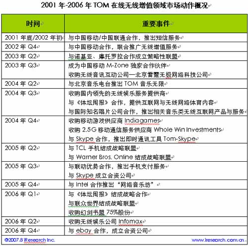 2000年中,TOM在線正式推出,這家一開始便以無線增值為特色的企業(yè)符合了當(dāng)時(shí)中國(guó)互聯(lián)網(wǎng)市場(chǎng)的環(huán)境,那時(shí)無線增值業(yè)務(wù)如火如荼,第五媒體的概念呼之欲出。隨后,便開始了與各大無線媒體、傳統(tǒng)媒體等一系列的合作和收購(gòu),所涉及的領(lǐng)域涵蓋短信、無線音樂、手機(jī)游戲、手機(jī)支付、手機(jī)體育新聞、即時(shí)通訊等許多行業(yè),一個(gè)龐大的無線媒體帝國(guó)看似已經(jīng)牢不可破。直到,2006年第四季度與ebay易趣合并,開始涉足電子商務(wù)。