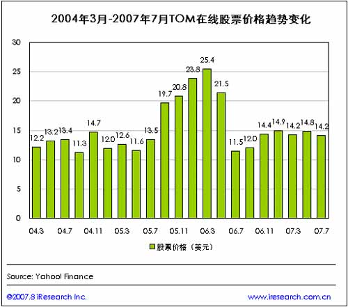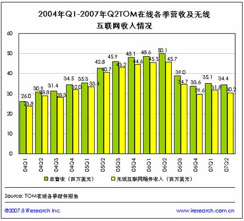 在2006年第二季度總營(yíng)收以及無線互聯(lián)網(wǎng)服務(wù)收入分別達(dá)到歷史最高點(diǎn)(分別達(dá)到5010萬(wàn)美元和4571萬(wàn)美元)之后,TOM在線各季收入及無線互聯(lián)網(wǎng)收入呈逐季下滑趨勢(shì),至2007年第二季度,TOM在線的總營(yíng)收為3439萬(wàn)美元,來自無線互聯(lián)網(wǎng)服務(wù)的收入為3024萬(wàn)美元!