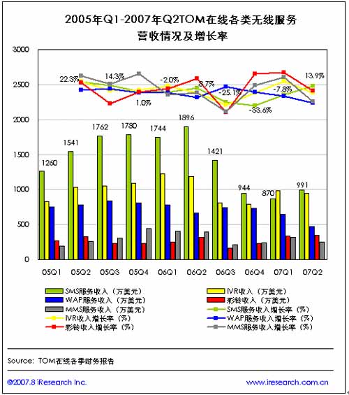 隨后,各無線服務(wù)收入則基本處于下滑趨勢(shì),在2007年第二季度,除短信服務(wù)收入達(dá)到991萬(wàn)美元,較上一季度增長(zhǎng)13.9%之外,MMS收入僅246萬(wàn)美元,環(huán)比減少23.1%,WAP服務(wù)收入為471萬(wàn)美元,環(huán)比減少27.3%。