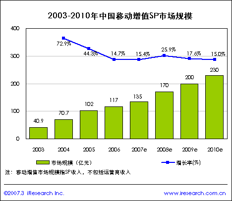 iResearch艾瑞市場(chǎng)咨詢研究成果《2007年移動(dòng)增值研究報(bào)告》顯示,2006年中國(guó)移動(dòng)增值SP市場(chǎng)規(guī)模達(dá)到117億元,比2005年增長(zhǎng)14.7%,近兩年移動(dòng)增值SP市場(chǎng)受政策因素影響增長(zhǎng)相對(duì)平緩,但隨著市場(chǎng)環(huán)境的成熟,3G商用和2008年奧運(yùn)都將對(duì)SP移動(dòng)增值市場(chǎng)有所推進(jìn),預(yù)計(jì)未來幾年中國(guó)移動(dòng)增值市場(chǎng)又會(huì)迎來一個(gè)新的發(fā)展高潮,艾瑞研究預(yù)測(cè)到2008年移動(dòng)增值SP市場(chǎng)規(guī)模將達(dá)到170億元,預(yù)計(jì)未來四年中國(guó)移動(dòng)增值市場(chǎng)規(guī)模將持續(xù)增長(zhǎng)。