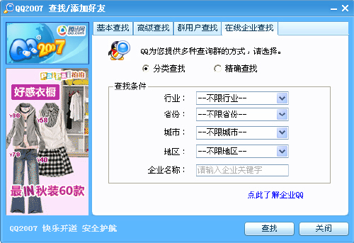 用戶點擊QQ面板上的"查找"圖標,將會發(fā)現(xiàn)在原有的3種查找通道外,新增了"企業(yè)用戶查找"功能。QQ用戶可以選擇分類查找,通過行業(yè)、省份、城市、地區(qū)等的匹配,來找到最符合查找條件的企業(yè),同時也可以通過關鍵字來模糊查找目標企業(yè)。如果確知企業(yè)的全稱或者企業(yè)QQ賬號,則可以一步到位精確查找到目標企業(yè)。