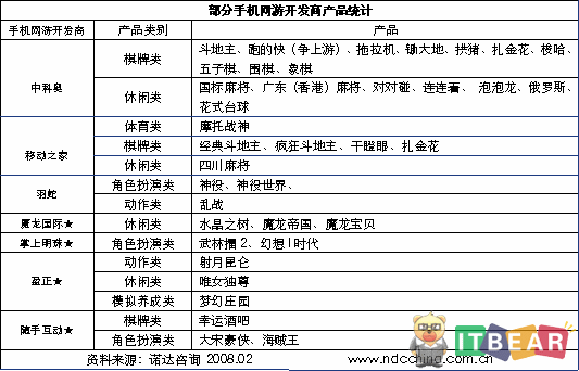 目前國內市場上運行的手機網(wǎng)游不下百種,單就手機網(wǎng)游開放來說,國內還沒有哪家或哪幾家開發(fā)商控制占據(jù)絕對優(yōu)勢的局面。下表列出了幾家手機網(wǎng)游開發(fā)商開發(fā)的手機網(wǎng)游產品。從表中可以看出中科奧開發(fā)的產品數(shù)量較多(18款),主要產品為棋牌與休閑類小游戲。其他的開發(fā)商開發(fā)的手機網(wǎng)游產品數(shù)量在2—5款之間,多為大型游戲。從游戲品種的不同可以看出主要開發(fā)商的研發(fā)方向有所區(qū)別。