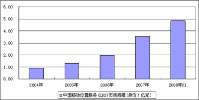 圖 1 2003-2008年上半年中國移動位置服務(wù)(LBS)市場規(guī)模