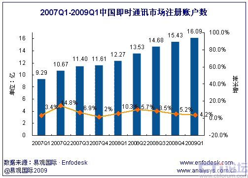 2009年第1季度中國(guó)即時(shí)通訊市場(chǎng)累計(jì)注冊(cè)賬戶數(shù)達(dá)16.1億