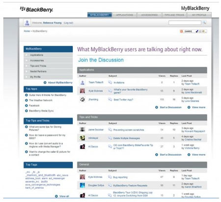 從某種程度而言,MyBlackBerry并不是一個真正的社交網站,而更像一個用戶留言板。網站具有一定的針對性,允許使用同型號設備的用戶進行交流。例如,使用BlackBerry