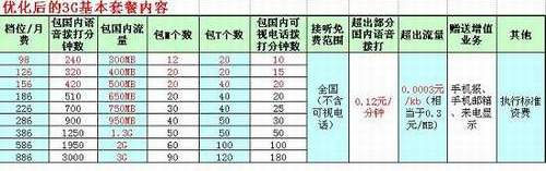 據(jù)了解,正式商用資費(fèi)包含9個等級,從98元-886元不等,取消了試商用期間最高的1686元套餐,新增了98元、126元和156元三項套餐,超出套餐的語音資費(fèi)也由原來的0.36元-0.24元/分鐘不等,調(diào)整為統(tǒng)一的0.12元/分鐘,比之試商用期間的半價資費(fèi)還要低。