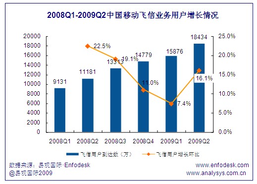 截至2009年第2季度,中國移動飛信用戶到達(dá)數(shù)達(dá)1.84億,環(huán)比增長16.1%,與2008年第2季度的1.12億用戶到達(dá)數(shù)相比同比增長64.9%,可見飛信用戶規(guī)模增長的速度十分迅速,究其原因一方面在于飛信運(yùn)營商不遺余力的多渠道營銷宣傳,另一方面在于飛信用戶的口碑傳播,由于用戶規(guī)模的增長帶來更多用戶嘗試體驗(yàn)飛信業(yè)務(wù)。