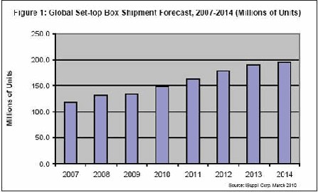 據(jù)iSuppli公司,機(jī)頂盒出貨量未來幾年將繼續(xù)增長。消費(fèi)者收看模式發(fā)生轉(zhuǎn)變,通過互聯(lián)網(wǎng)提供的電視內(nèi)容越來越流行,從而將為提供商創(chuàng)造條件,在數(shù)字家庭的激烈爭(zhēng)奪中獲得新的營業(yè)收入來源。
