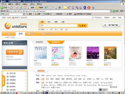 圖:聯(lián)通Unistore手機(jī)應(yīng)用商城測(cè)試頁(yè)面