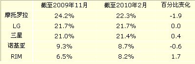 以下為各大OEM廠商截至2009年11月的三個月平均市場份額與截至2010年2月的三個月平均市場份額對比: