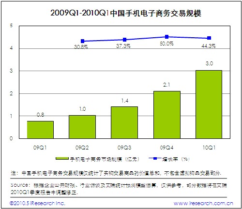 根據(jù)艾瑞咨詢即將發(fā)布的2010年第一季度中國移動(dòng)互聯(lián)網(wǎng)市場數(shù)據(jù)顯示,2010Q1中國移動(dòng)互聯(lián)網(wǎng)市場整體交易規(guī)模達(dá)到44.9億,環(huán)比增長5.2%。艾瑞咨詢分析認(rèn)為,盡管電信運(yùn)營商計(jì)費(fèi)政策調(diào)整,對移動(dòng)增值市場收入產(chǎn)生負(fù)面影響,但是手機(jī)電子商務(wù)、手機(jī)搜索等業(yè)務(wù)領(lǐng)域的良好市場表現(xiàn),推動(dòng)移動(dòng)互聯(lián)網(wǎng)市場規(guī)模平穩(wěn)增長。