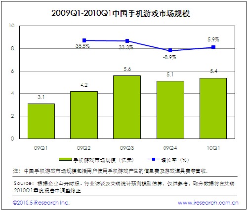 2010Q1中國手機(jī)游戲市場規(guī)模為5.4億,環(huán)比增長5.9%.2009年底電信運(yùn)營商調(diào)整業(yè)務(wù)合作伙伴計(jì)費(fèi)政策,導(dǎo)致WAP和G+手機(jī)游戲平臺等特定計(jì)費(fèi)平臺暫時(shí)停止計(jì)費(fèi),對手機(jī)游戲市場營收增長產(chǎn)生不利影響。除了季節(jié)因素以外,手機(jī)單機(jī)游戲受電信運(yùn)營商暫停WAP計(jì)費(fèi)影響較大,手機(jī)網(wǎng)游受政策影響有限。盡管本季度手機(jī)游戲市場扭轉(zhuǎn)營收規(guī)模下滑的不利局面,重新恢復(fù)增長態(tài)勢,但是手機(jī)游戲?qū)﹄娦胚\(yùn)營商計(jì)費(fèi)通道的高依存度,決定行業(yè)受政策風(fēng)險(xiǎn)的影響較大。實(shí)現(xiàn)營收多元化是手機(jī)游戲業(yè)界思考和關(guān)注的問題。