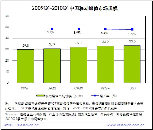 電信運(yùn)營商計(jì)費(fèi)政策重大調(diào)整對整個(gè)移動(dòng)增值市場產(chǎn)生巨大影響力,2010Q1移動(dòng)增值市場規(guī)模為33.5億,與09Q1基本持平。電信運(yùn)營商實(shí)施計(jì)費(fèi)通道的強(qiáng)力治理措施,對產(chǎn)品線以WAP計(jì)費(fèi)為主的企業(yè)造成嚴(yán)重生存壓力,與此同時(shí)采用短信計(jì)費(fèi)的移動(dòng)增值產(chǎn)品營銷也受到不同程度影響。實(shí)現(xiàn)由單一移動(dòng)增值業(yè)務(wù)向移動(dòng)互聯(lián)網(wǎng)服務(wù)進(jìn)行戰(zhàn)略轉(zhuǎn)型,是SP企業(yè)戰(zhàn)略發(fā)展的實(shí)踐路徑。艾瑞認(rèn)為電信運(yùn)營商實(shí)施全新的合作伙伴計(jì)費(fèi)政策,將重新構(gòu)建移動(dòng)增值市場秩序。