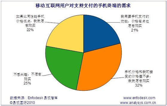 據(jù)Enfodesk易觀(guān)智庫(kù)最新報(bào)告《中國(guó)移動(dòng)互聯(lián)網(wǎng)市場(chǎng)用戶(hù)研究報(bào)告2010》研究發(fā)現(xiàn),目前在移動(dòng)互聯(lián)網(wǎng)用戶(hù)中,有75%的用戶(hù)對(duì)具有移動(dòng)支付功能的手機(jī)表現(xiàn)出明顯的興趣,其中影響不大,完全靠性?xún)r(jià)比決定是否購(gòu)買(mǎi)的用戶(hù)占比最多,約為32%,只有在移動(dòng)具備支付功能的手機(jī)和可接受價(jià)格相近時(shí)才會(huì)購(gòu)買(mǎi)。另外21%的人由于對(duì)移動(dòng)支付業(yè)務(wù)需求程度較高,愿意為此付出更高價(jià)格,其他22%的用戶(hù)則在比同性能手機(jī)價(jià)格低些之后,才會(huì)進(jìn)行消費(fèi)。除此之外,還有25%的用戶(hù)對(duì)于具備支付功能的手機(jī)沒(méi)有絲毫興趣,不愿意購(gòu)買(mǎi)。