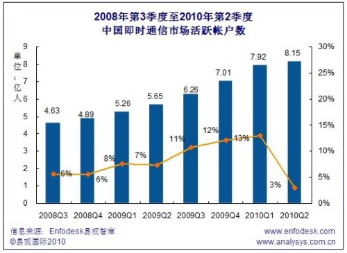 2010Q2中國即時(shí)通信市場(chǎng)活躍帳戶數(shù)超過8億