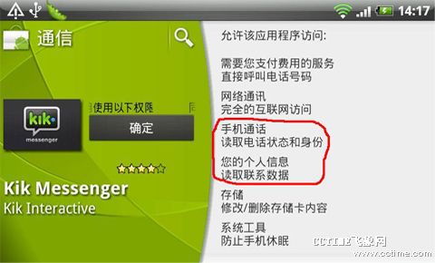 國內(nèi)外Kik類應(yīng)用也逐漸興起,騰迅最近也加入此陣營并推出其下產(chǎn)品微信。Kik類應(yīng)用主要以用戶手機中聯(lián)系人目錄為主要的關(guān)系抓取,只要其聯(lián)系人中裝入該客戶端,用戶無需特意添加即可開始類似短信的聊天。以KikMessenger為例,其中便涉及讀取用戶聯(lián)系人信息、電話狀態(tài)和身份等權(quán)限。