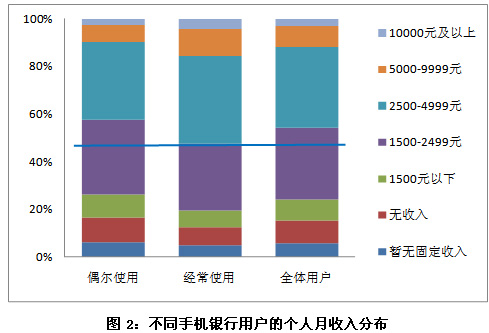 通過對不同手機銀行用戶的個人月收入分布可以看出,經(jīng)常使用手機銀行業(yè)務(wù)的用戶的個人月收入偏高,其中,個人月收入5000元以上的比例為15.4%,2500元以上的比例為52.2%,均高于偶爾使用手機銀行業(yè)務(wù)的用戶。事實上,經(jīng)常使用手機銀行業(yè)務(wù)的用戶由于收入偏高且手機銀行使用頻率高,必然成為手機銀行業(yè)務(wù)的核心客戶,這一較為富裕的目標(biāo)群體將在很大程度上促進(jìn)手機銀行業(yè)務(wù)的繁榮。