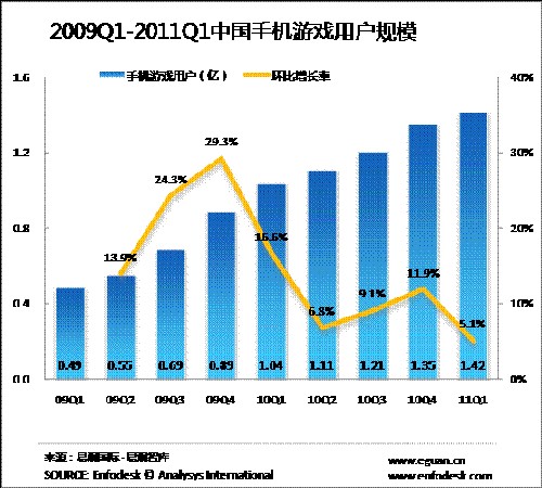 結(jié)合上圖所示,手機(jī)游戲用戶規(guī)模在經(jīng)歷了2009年爆炸性增長和2010年理性回歸后,在 2011年第1季度進(jìn)入緩慢增長期。