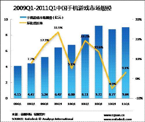 2011年第1季度手機(jī)游戲市場(chǎng)規(guī)模達(dá)9.04億元