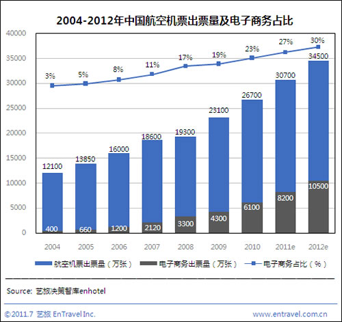 2011年上半年中國機票電子商務(wù)交易額達310億元,同期民航機票交易額為1250億元,電子商務(wù)占比升至25%,距美國45%的滲透率仍有差距。預(yù)計2011全年中國航空機票電子商務(wù)交易額將達640億元,而民航機票交易額將達2600億元。