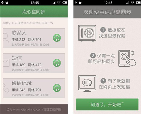 點(diǎn)心盒同步使用十分方便,在手機(jī)上安裝客戶端,通過注冊獲取賬號,登陸后進(jìn)入軟件的主界面,僅需輕點(diǎn)同步按鈕,即可將聯(lián)系人、短信和通話記錄同步到點(diǎn)心盒網(wǎng)站上。此時,不僅在手機(jī)端,用戶在云端通過點(diǎn)心盒網(wǎng)站也可以進(jìn)行聯(lián)系人新建、編輯和刪除的操作,并支持聯(lián)系人導(dǎo)入和去除重復(fù)的聯(lián)系人,方便聯(lián)系人管理。