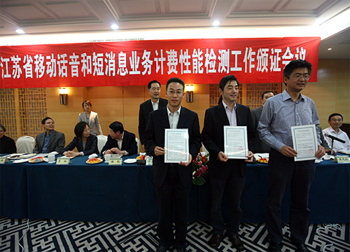 會(huì)上,檢測(cè)單位公布了移動(dòng)話音和短消息業(yè)務(wù)計(jì)費(fèi)檢測(cè)的相關(guān)標(biāo)準(zhǔn)和本次計(jì)費(fèi)檢測(cè)的合格清單。省通信管理局向江蘇電信、江蘇移動(dòng)、江蘇聯(lián)通共39家地市公司頒發(fā)了移動(dòng)話音和短消息業(yè)務(wù)計(jì)費(fèi)性能檢測(cè)合格證書。