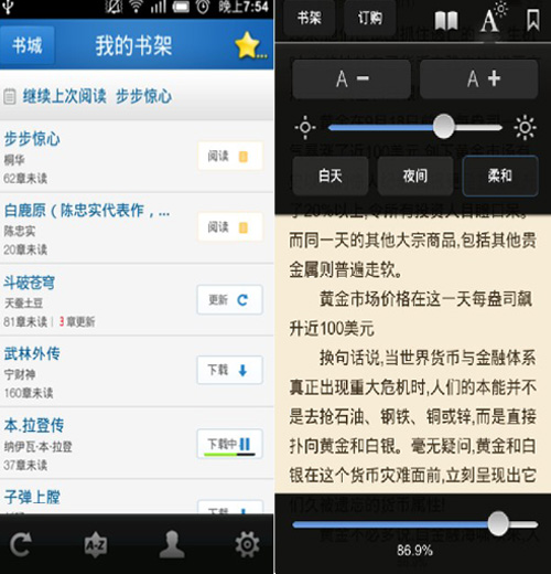 書架部分就是擺放所有你下載的和購買的書籍的地方,在這里如果你在看的電子書有新章節(jié)更新,它會在書架中提示你。閱讀界面支持白天、夜間和柔和三種閱讀模式,適合不同時(shí)段閱讀。但是根據(jù)馬勇的介紹,調(diào)整字體的技術(shù)才是這里最大的特點(diǎn),當(dāng)你調(diào)整字體時(shí),相應(yīng)段落之間的間距也會對應(yīng)調(diào)整,不會出現(xiàn)字體變小后文章段落間距很大的問題。