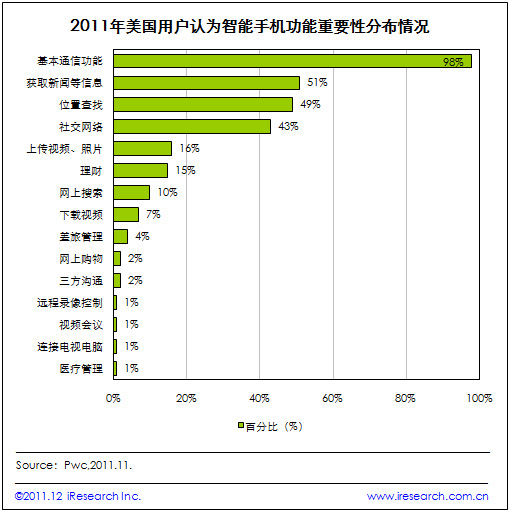 艾瑞咨詢根據(jù)Pwc近日發(fā)布的美國移動互聯(lián)網(wǎng)用戶演變研究報告發(fā)現(xiàn),用戶對移動設(shè)備的使用和依賴程度增強,同時,通過對用戶使用智能手機功能的調(diào)查發(fā)現(xiàn),用戶認(rèn)為最重要的功能主要集中在基本通信、獲取資訊信息、位置查找和社交網(wǎng)絡(luò)上。