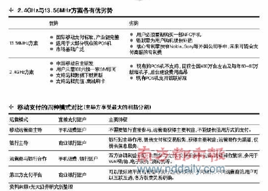 對(duì)此,國(guó)金證券發(fā)布了一份研究報(bào)告稱,相對(duì)于13 .56MHz方案而言,2.4GHz方案在推廣上有先天的優(yōu)勢(shì)。畢竟13.56M H z方案必須對(duì)手機(jī)重新設(shè)計(jì),需要等待手機(jī)產(chǎn)業(yè)鏈對(duì)13.56M H z的逐步支持,時(shí)間周期較長(zhǎng);同時(shí),更換13.56M H z手機(jī)帶來(lái)的重置成本無(wú)論是由用戶承擔(dān)還是由運(yùn)營(yíng)商承擔(dān)都是一筆高額的費(fèi)用,推廣難度較高。而2.4G H z方案僅需更換SIM卡便可完成對(duì)手機(jī)的改造,不用等待終端產(chǎn)業(yè)鏈的成熟;同時(shí)改造成本低,便于運(yùn)營(yíng)商進(jìn)行促銷推廣。
