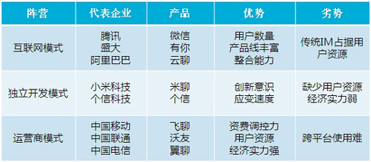 國內(nèi)移動(dòng)IM領(lǐng)域正式進(jìn)入群雄爭霸時(shí)代,并形成了移動(dòng)互聯(lián)網(wǎng)新興企業(yè)、互聯(lián)網(wǎng)巨頭、運(yùn)營商三大陣營。