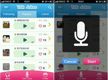 Talk Jokes是一款輕量級(jí)語音笑話分享應(yīng)用,鼓勵(lì)用戶通過真人錄音的方式上傳和分享自己的笑話,專注于“講笑話”的這部分語音垂直市場。