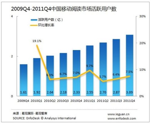 2011年第4季度中國(guó)手機(jī)閱讀活躍用戶突破3億